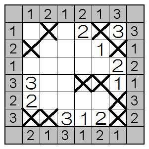 ヒントは上から3・2・1の順で入ること、数字はその右のヒントと一致していなければいけないので、3×21の順に入ります。