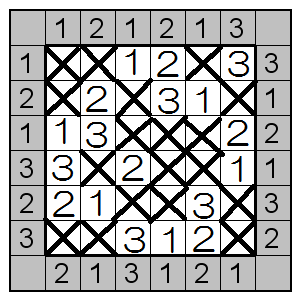 3段目。左から132の順なので、3の左に1を入れます。残り右側のマスは全部×です。